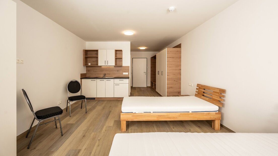Das Wohnhaus umfasst 62 Einzelzimmer und 18 Doppelzimmer, die jeweils mit eigenen Bädern, Kochgelegenheiten sowie Balkonen oder Terrassen ausgestattet sind und komfortables Wohnen in unmittelbarer Nähe zum Arbeitsplatz ermöglichen.