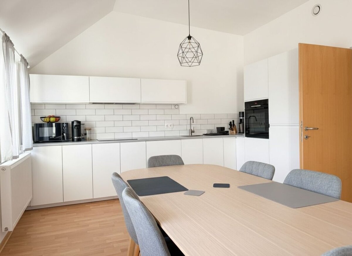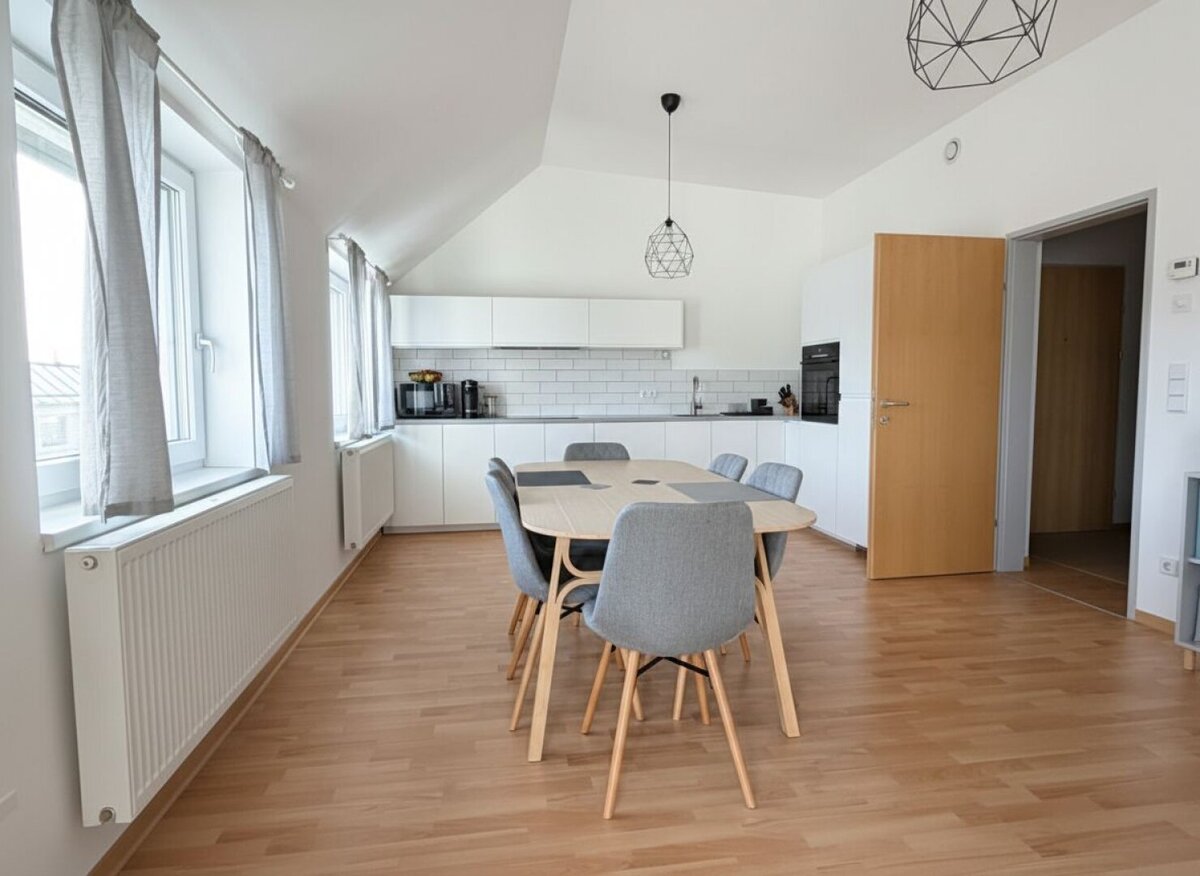 Das Herzstück der Wohnung ist der helle Wohnbereich mit direktem Zugang zum Balkon. Ob Sonntagsfrühstück mit der Familie, entspannte Stunden an der frischen Luft oder gesellige Abende mit Freunden – hier genießen Sie Lebensqualität pur. Der Küchenbereich ist harmonisch in den Wohnraum integriert und schafft eine offene, einladende Atmosphäre.