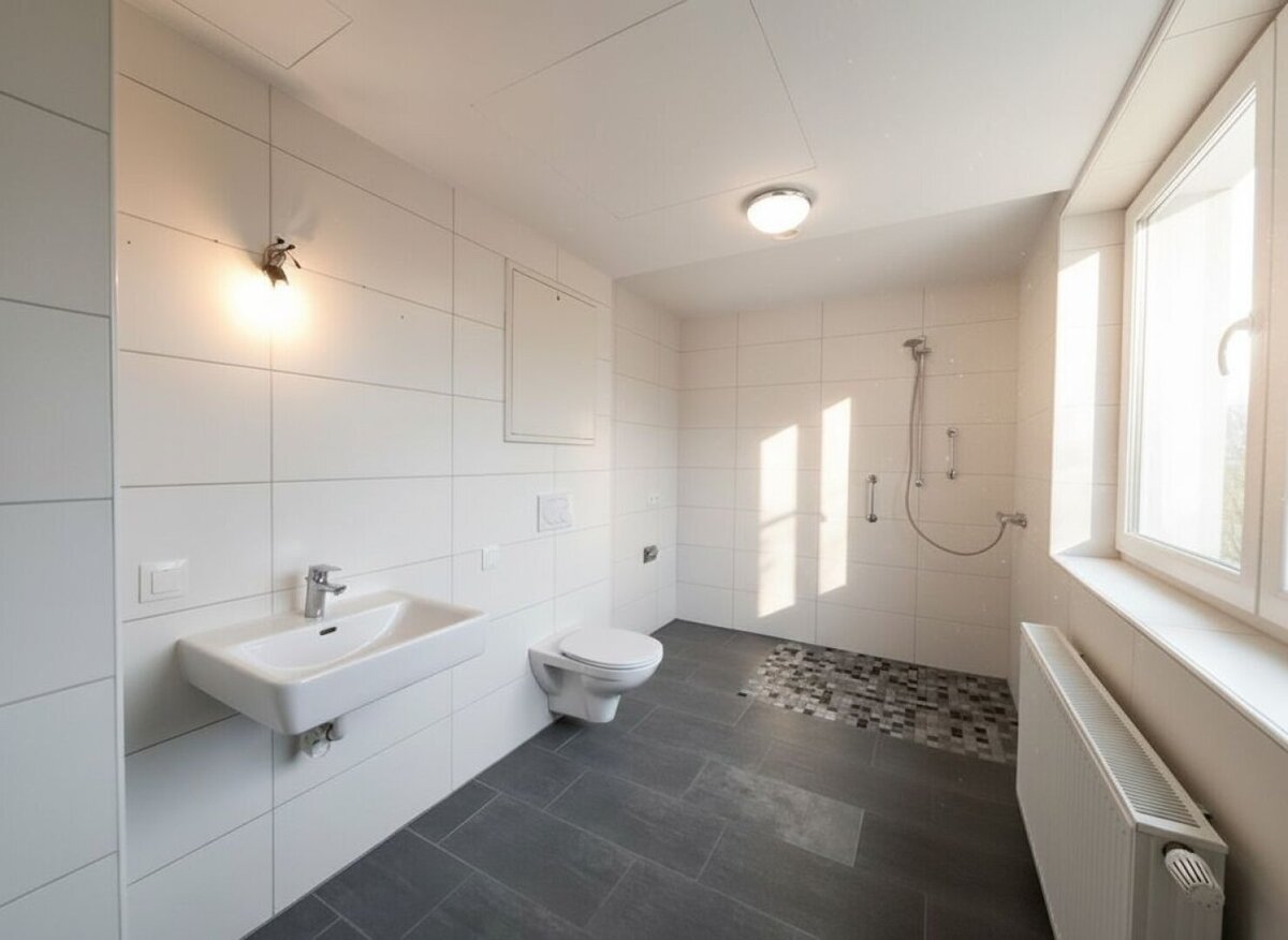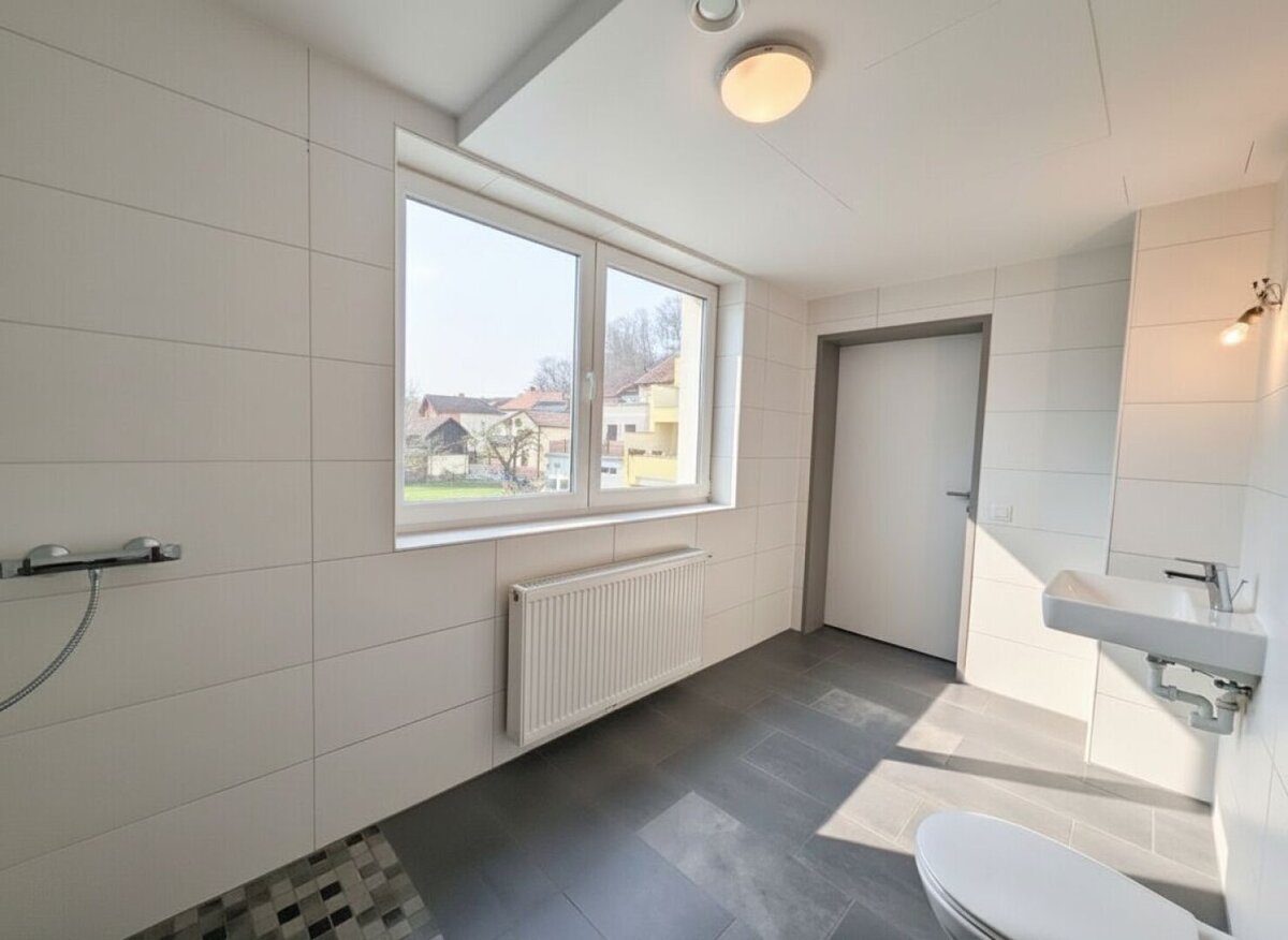 Das modern verflieste Badezimmer ist hochwertig ausgestattet und verfügt über eine bodengleiche Dusche, ein Handwaschbecken, ein WC sowie einen Waschmaschinenanschluss.