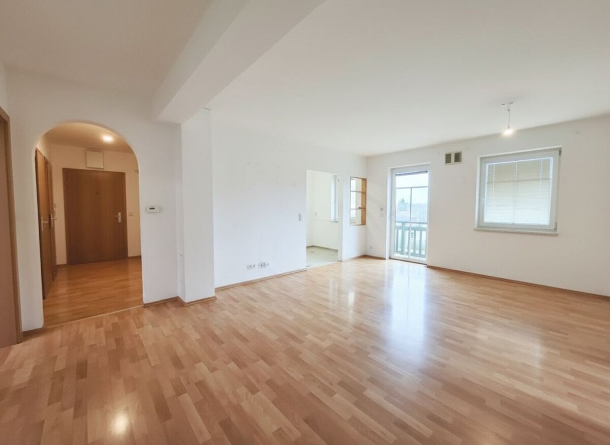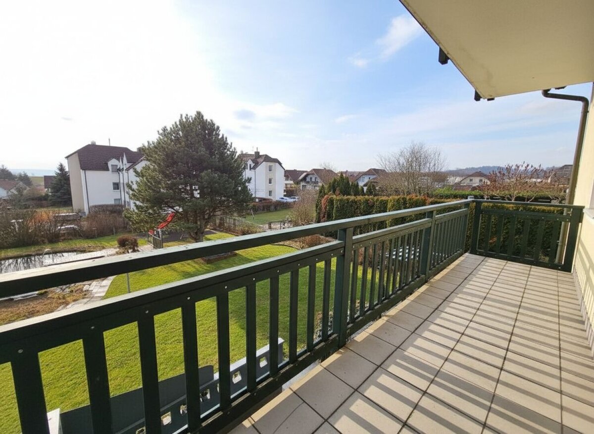 Vom geräumigen Wohnzimmer gelangt man auf den herrlichen Balkon. Hier lässt es sich optimal entspannen oder das Sonntagsfrühstück mit der Familie genießen. Besonders toll ist hier auch der Blick ins Grüne.