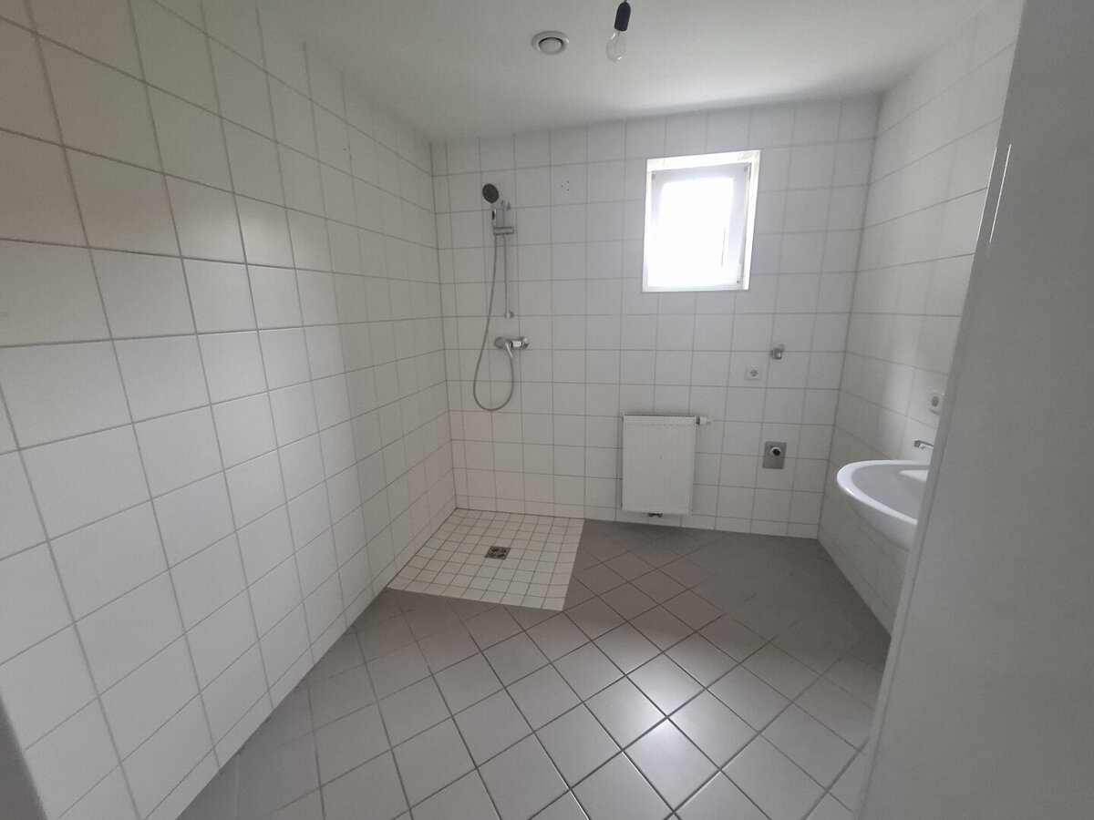 Das Badezimmer ist modern verfliest und mit einer praktischen bodenebenen Dusche, einem Handwaschbecken und einem Waschmaschinenanschluss ausgestattet.