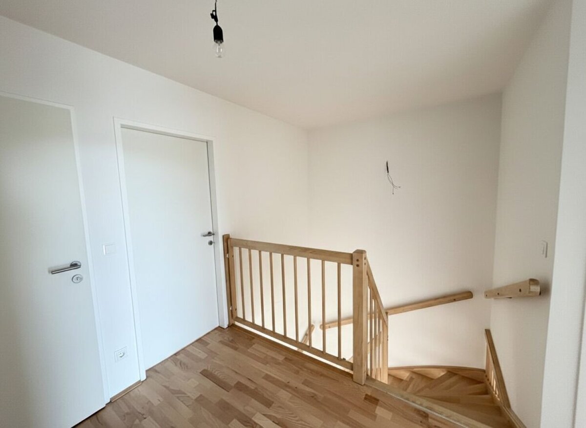 Über eine stilvolle Holztreppe erreichen Sie das Dachgeschoss. Dort stehen Ihnen drei weitere Zimmer, ein Vorraum sowie ein zusätzlicher Abstellraum zur Verfügung. Das Badezimmer überzeugt mit Badewanne, Handwaschbecken und Waschmaschinenanschluss. Ein Fenster sorgt für angenehmes Tageslicht und schafft eine freundliche Atmosphäre – ideal für entspannte Momente nach einem langen Tag.