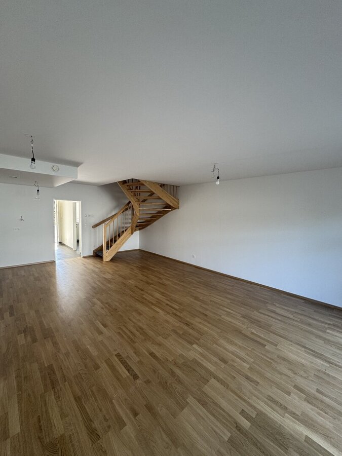Im Erdgeschoss erwartet Sie ein Vorzimmer, ein WC, ein praktischer Abstellraum, ein vielseitig nutzbarer Hausarbeitsraum und ein großzügiges Wohnzimmer mit perfekt integrierter Kochnische. Vom Wohnzimmer aus gelangen Sie direkt auf die Terrasse und in den Eigengarten. Der Hausarbeitsraum bietet zusätzlichen Stauraum und lässt sich flexibel nutzen.