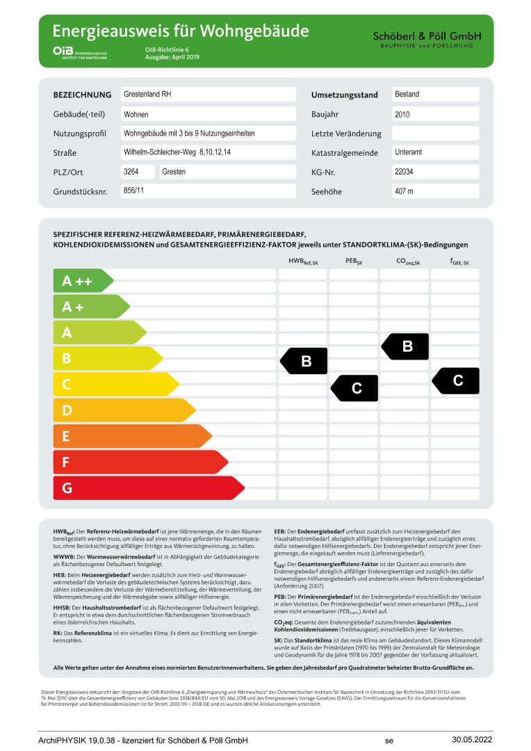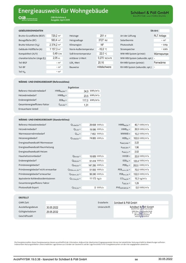 Energiekennzahlen: Laut Energieausweis vom 30.05.2022 beträgt der Heizwärmebedarf 40,7 kWh/m²a Klasse B und der Gesamtenergieeffizienz-Faktor 1,29 Klasse C.