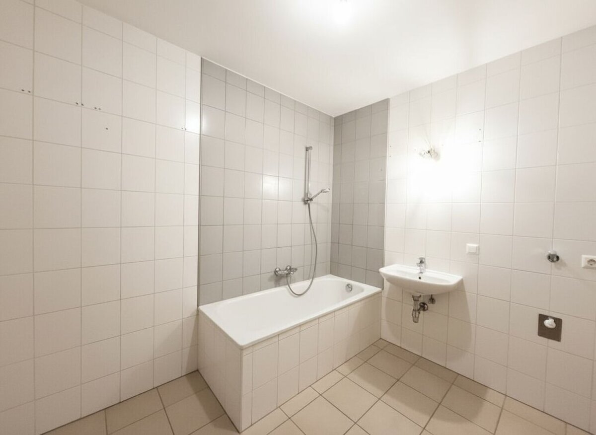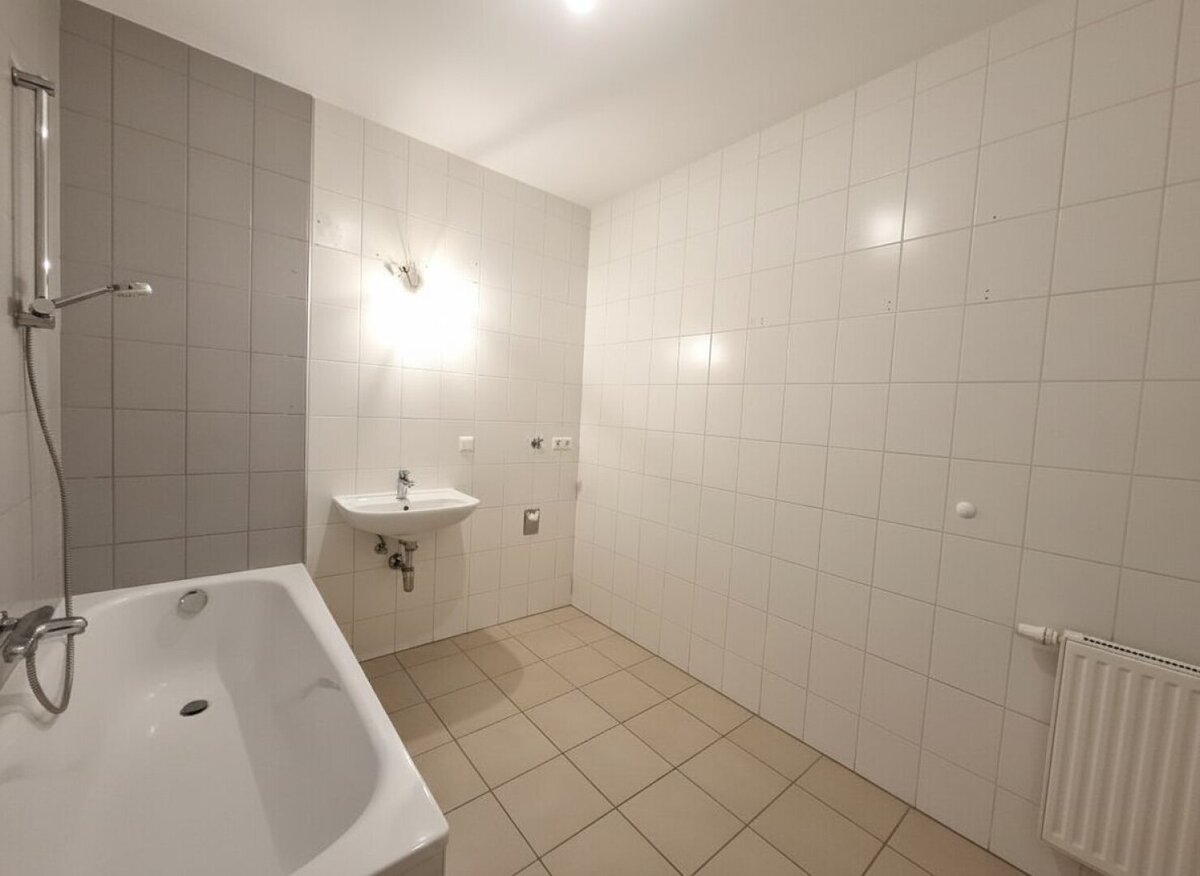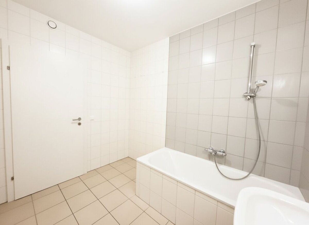 Das Badezimmer ist mit einer Badewanne, einem Waschbecken und einem Waschmaschinenanschluss ausgestattet, während das WC separat angelegt ist.