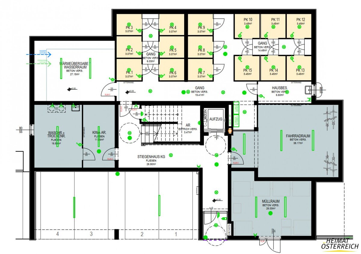 Zur Wohnung gehören ein Autoabstellplatz sowie ein eigenes Kellerabteil. Die Wohnhausanlage bietet darüber hinaus einen Lift, einen Fahrrad- und Kinderwagenabstellraum, einen Trockenraum sowie einen Müllraum. Beheizt wird die Anlage mittels umweltfreundlicher Pelletszentralheizung.