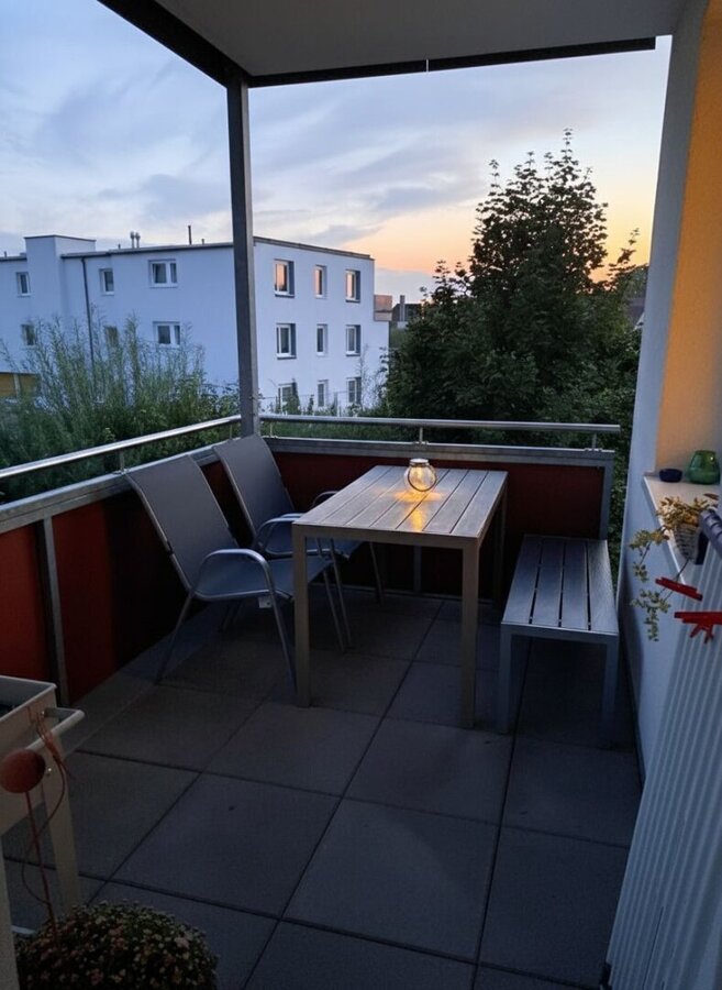Vom geräumigen Wohnzimmer aus gelangen Sie direkt auf den schönen Balkon – der perfekte Ort, um die Seele baumeln zu lassen und den Ausblick zu genießen.