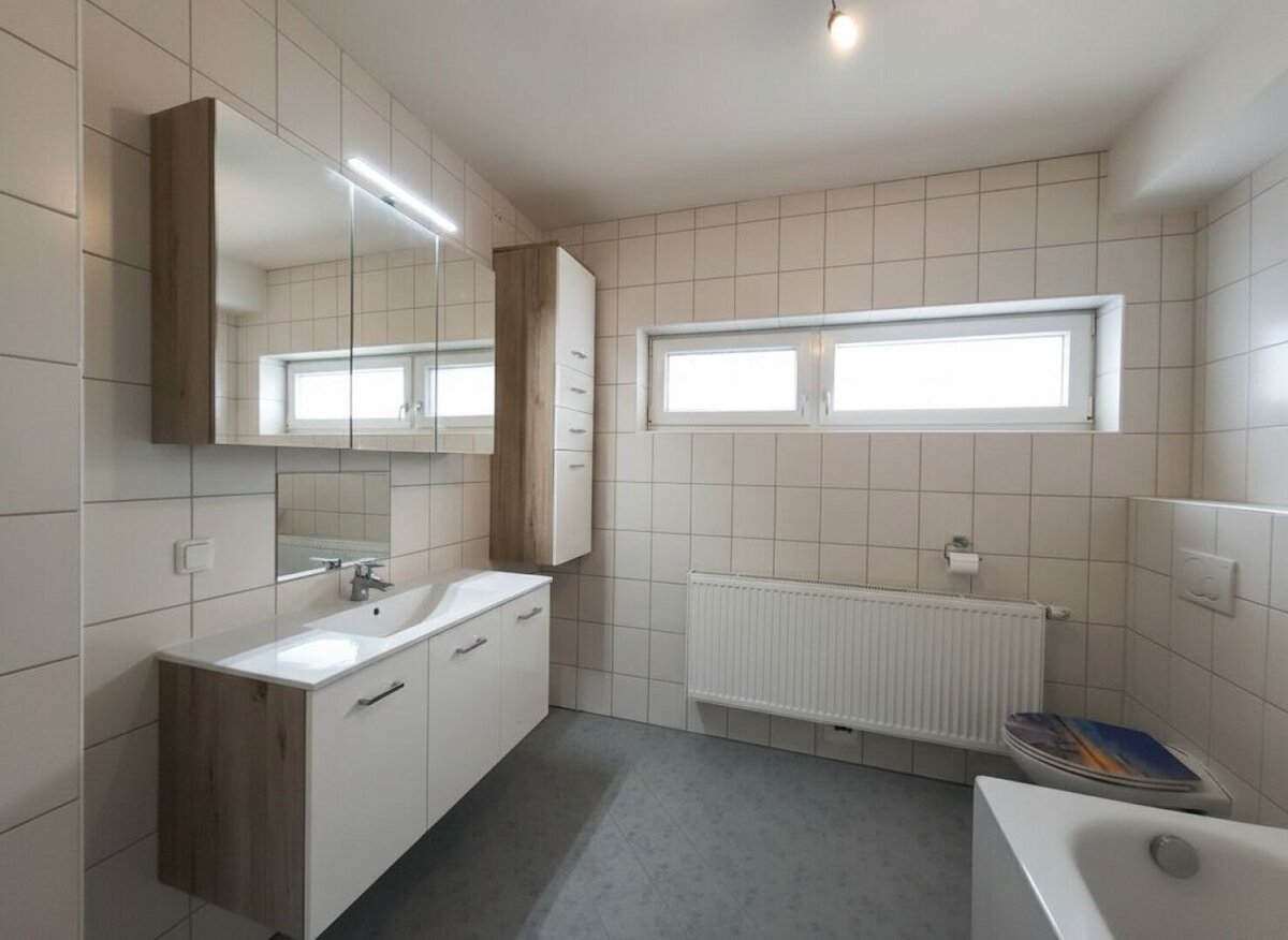 Das Obergeschoss bietet drei weitere Zimmer, einen zusätzlichen Abstellraum und ein modernes Badezimmer mit Badewanne, WC und Fenster. Moderne Laminatböden und Fliesen sorgen für ein zeitgemäßes Wohnambiente. Ein Gartenhaus bietet praktischen Stauraum, und ein Carport-Abstellplatz rundet das Angebot ab.
