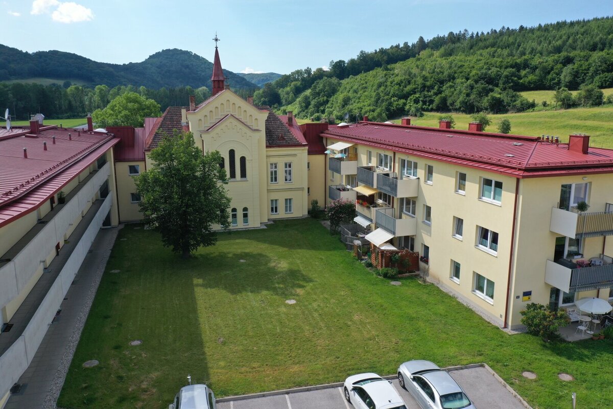Zur Wohnung gehören zwei Autoabstellplätze und ein Aufzug erleichtert den Alltag. Die Umgebung überzeugt mit viel Natur und gesunder Luft – ideal zum Abschalten und Durchatmen.
