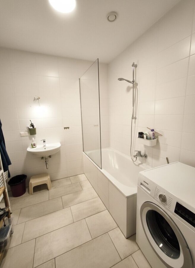 Für extra Stauraum sorgt der praktische Abstellraum. Badezimmer und WC sind getrennt und mit Fliesen ausgestattet. Im Badezimmer befinden sich eine Badewanne, ein Waschbecken und ein Waschmaschinenanschluss.