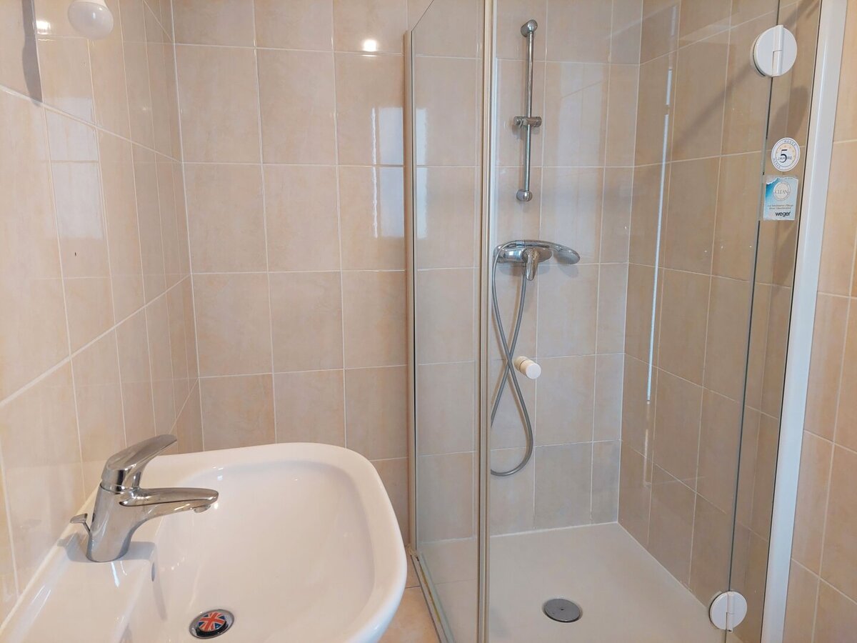 Das modern verflieste Badezimmer ist mit einer bodenebenen Dusche, einem Handwaschbecken und einem Waschmaschinenanschluss ausgestattet. Im Badezimmer befindet sich ein Fenster, welches direkt auf den eigenen Balkon blickt. Das WC ist separat angelegt und ebenfalls modern verfliest.